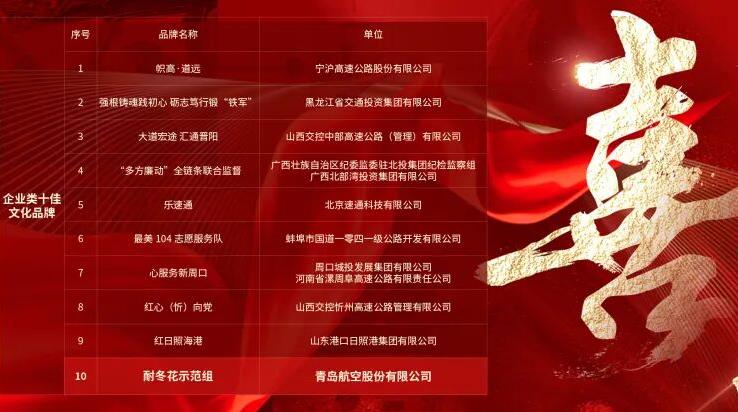 喜報!青島航空榮獲第七屆交通運輸優(yōu)秀文化品牌“十佳”稱號
